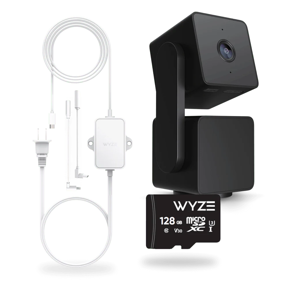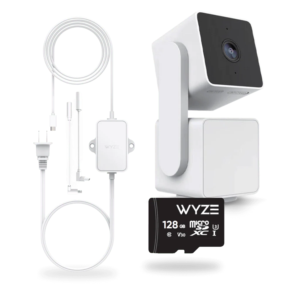 Wyze Cam Pan v3 is a redesigned indoor/outdoor, 360° pan and 180° tilt security camera, and is fully IP65 weather resistant. Pop in the included 128GB MicroSD card for nonstop recording and fun time lapses that capture every tiny detail. Plus, the Wyze Outdoor Power Adapter keeps things safely powered up so you never miss a beat.