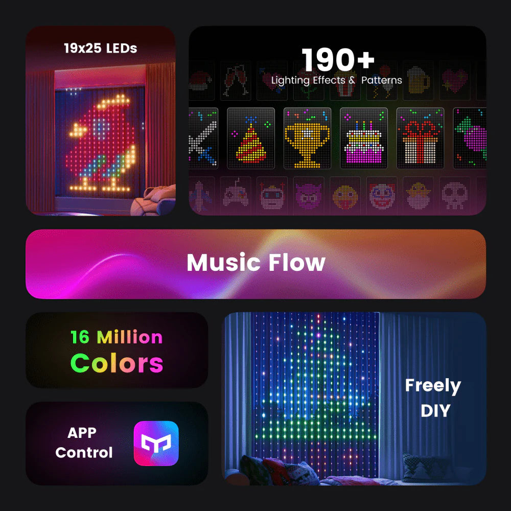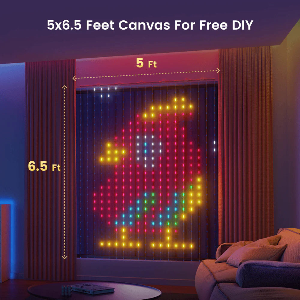 With 475 LEDs across a 5x6.5 Ft canvas, each LED can be individually controlled. Customize any pattern with 16 million colors, offering endless options for color changing and unique backdrops for special occasions. Control it all from a single Yeelight app.